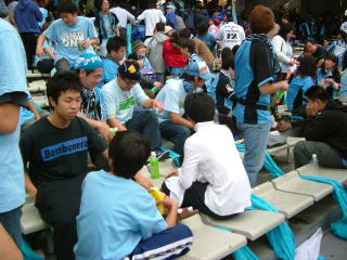 | ぜぇぜぇ… 勝ったぞ! J1ヴィッセル神戸に3−2で勝利! 勝利を見届けたサポーターはぐったり。 90分繰り広げた激しい応援を裏付ける光景です。 |