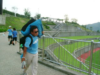 さすが応援家 2日連続での応援にもかかわらず、今日も涼しい顔で太鼓を叩きまくる応援家・野崎氏。 それもそのはず、彼は応援用にオプチマイズされた筋肉によって、どんな過酷な応援でも難なくこなせるのです。 ホント頼もしいですね。 でも、こちらの試合の方は敗色濃厚…。 |