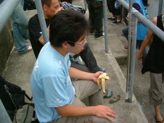 応援家・野崎氏、精神統一 試合に向けて気持ちを高めていく応援家・野崎氏。 バナナを食べ終わればすっかり勝負師の顔です。 |
