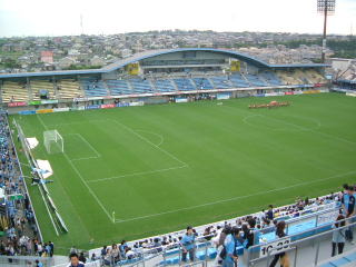 ヤマハスタジアム そそり立つバックスタンドからスタジアム全体を一望。 やっぱりサッカー専用スタジアムはいいよね。 ゴール裏はこんな感じ。迫力満点だよね。 |