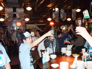 | 「1年間お疲れ様!カンパーイ!」 コボリ氏の掛け声とともに納会スタート! 皆さん、ホントお疲れ様でした。 なんだか毎年言っていますが、サポーターにとって今までこれほど大変なシーズンはなかったんじゃないでしょうか!?シーズン当初から終盤まで、実に激動の1年でしたね…。 でも、今となってはそれも心地よい思い出。 積もる話を酒の肴に、とにかく今夜はとことん飲みましょう! |