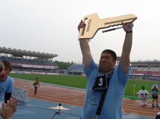 ハイエース贈呈 スポンサーでもある横浜トヨペット様からフロンターレにハイエース1台が寄贈されるということで、試合前にその贈呈イベントがありました。 いきなり社長からキーを奪う36氏。 これがやってみたかった! …決してサポーターに寄贈されたわけではありません。 |