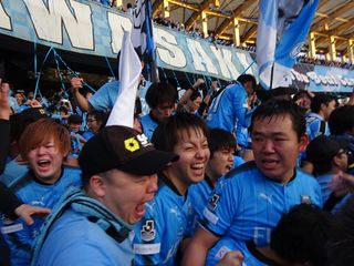| 「優勝だっ!!!!」 アントラーズの試合結果が会場に伝わり、ようやく状況を理解したGゾーンサポーター。 シュウシュウと青覇テープが音を立てて飛び交う中、腕を突き上げて叫び出す人、抱き合って喜び合う人、人目をはばからず号泣する人、これまでずっと堪えてきたサポーターの感情という感情が一気に大爆発!! 川崎フロンターレ、J1初制覇。 |