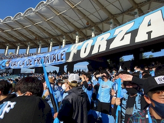 | 西日が強すぎるGゾーン 強い西日を浴びて酷暑となるGゾーン、 冬だからと油断して日焼け対策を怠ったサポーターのみんなはすでに顔が真っ赤。これ、飛び跳ねて応援していたら完全に熱中症起こすやつじゃない? 試合は0−0のまま延長戦。 悪い予感しかしません。 |